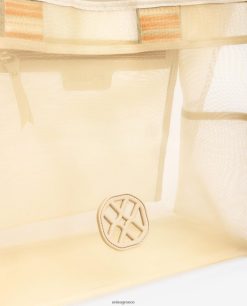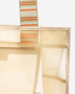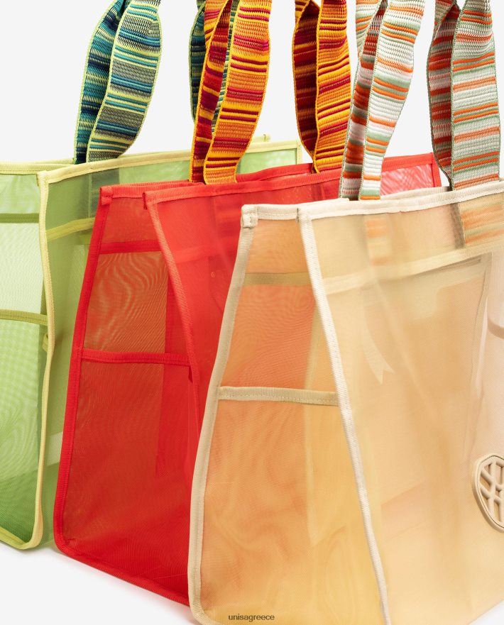 μεγάλη διχτυωτή τσάντα διαθέσιμη σε διάφορα χρώματα. Κλείσιμο με μαγνητικό κούμπωμα και εσωτερική τσέπη με φερμουάρ. κοντά πολύχρωμα λουράκια και λαστιχένιο λογότυπο στο μπροστινό μέρος. μέγεθος: 31cm x 41cm x 17cm
