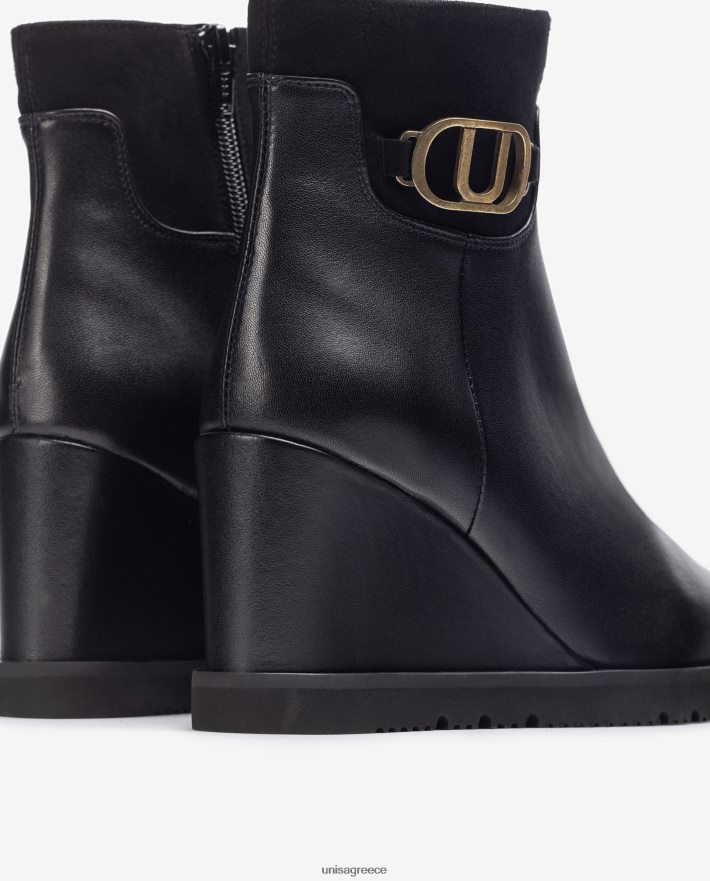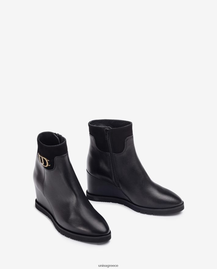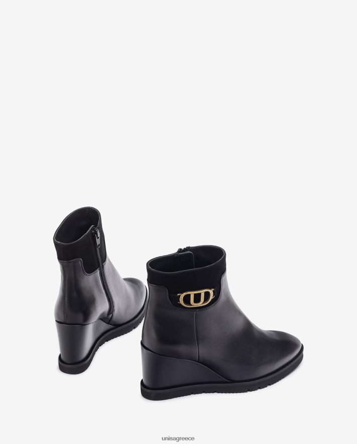 δερμάτινο μποτάκι με φερμουάρ στο εσωτερικό. Τέταρτη κορυφαία γραμμή από σουέτ και μεταλλική επένδυση στο πλάι. ελαφριά σφήνα κατασκευασμένη με τεχνολογία superlight ύψους 8cm σε ασορτί χρώμα και πλατφόρμα 1,5cm. Η unisa υποστηρίζει νέα σχέδια και δημιουργίες για αυτή τη νέα σεζόν aw22.