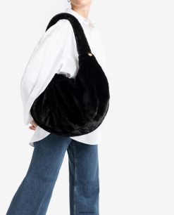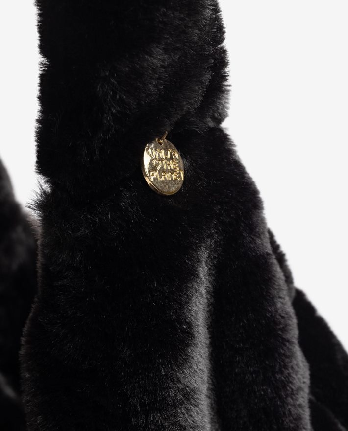τσάντα hobo μεσαίου μεγέθους από ανακυκλωμένο γούνινο ύφασμα. Κλείσιμο με μαγνητικό κούμπωμα και επένδυση λογότυπου που κρέμεται στη λαβή. 31 cm x 35 cm x 17 cm