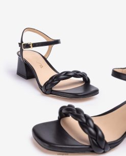 πέδιλο τετράγωνο από δέρμα. φαρδύ τακούνι 5 εκατοστών σε ταιριαστό τόνο και λουράκι με πλέξη στο μπροστινό μέρος. λουράκι αστραγάλου που μπορεί να ρυθμιστεί με τη μεταλλική πόρπη. δερμάτινη σόλα.