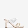 πέδιλο τετράγωνο από δέρμα μεταλλικό. ασορτί φαρδιές στριφτές τιράντες στο βαμπ και στο μπροστινό μέρος. 8cm ασορτί τετράγωνο τακούνι. δερμάτινη σόλα.