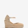 Δερμάτινες εσπαντρίγιες σε στυλ vamp-heel σε διάφορα χρώματα, με λουράκι στον αστράγαλο από raffia και λουράκι στο κάτω μέρος σε καστόρι που μπορεί να ρυθμιστεί χρησιμοποιώντας τη μεταλλική αγκράφα. Τακούνι σφήνας 9 εκ. και πλατφόρμα 2 εκ., καλυμμένο με πλεγμένη γιούτα. αντιολισθητική σόλα από καουτσούκ.