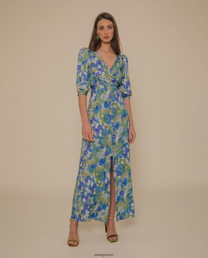 είναι ένα χαλαρό μίντι φόρεμα, με μακριά φουσκωτά μανίκια και λαιμόκοψη σε σχήμα v. λεπτή εφαρμογή στη μέση με φιόγκο και ρέουσα φούστα που έχει άνοιγμα μπροστά που κουμπώνει μέχρι το γόνατο. τα κουμπιά καλύπτονται από το ίδιο ύφασμα.