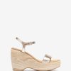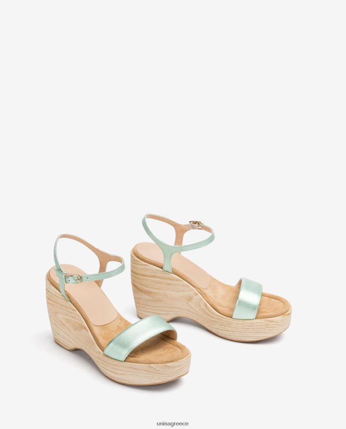 πέδιλο σε διάφορα χρώματα από μεταλλικό δέρμα, λουράκι στο πίσω μέρος που ρυθμίζεται με τη μεταλλική αγκράφα. μπλοκ με εφέ ξύλου pu με τακούνι 10cm και πλατφόρμα 4cm. unisa essence στην καθαρή της κατάσταση.