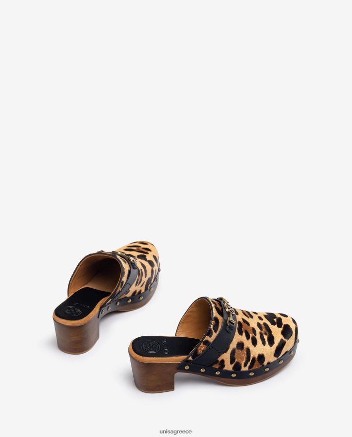 τσόκαμα από γούνινο δέρμα με στάμπα λεοπάρ. μονόγραμμα περικοπή. μπλοκ με πολύ ελαφρύ εφέ ξύλου με τακούνι 5,5 cm και πλατφόρμα 3 cm.