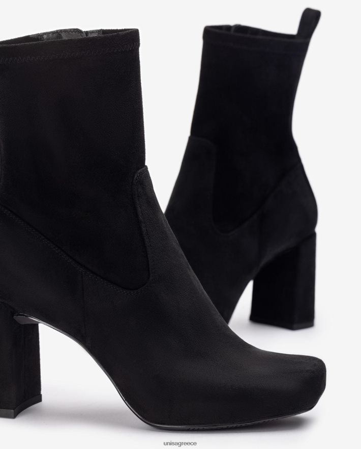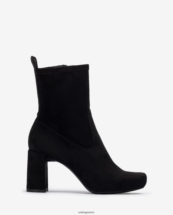 μποτάκι αστραγάλου σε τετράγωνο δάχτυλο από ελαστικό ύφασμα σε εφέ σουέντ. Τακούνι 8 cm και εσωτερική πλατφόρμα 1,7 cm. ελαφριά, εύκαμπτη, αντιολισθητική σόλα από καουτσούκ. τελειώματα ραφής στο μπροστινό μέρος. ένα βασικό κλασικό στον κόσμο της unisa.