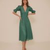 είναι ένα χαλαρό μίντι φόρεμα, με μακριά φουσκωτά μανίκια και λαιμόκοψη σε σχήμα v. λεπτή εφαρμογή στη μέση με φιόγκο και ρέουσα φούστα που έχει άνοιγμα μπροστά που κουμπώνει μέχρι το γόνατο. τα κουμπιά καλύπτονται από το ίδιο ύφασμα.