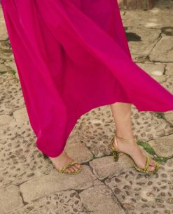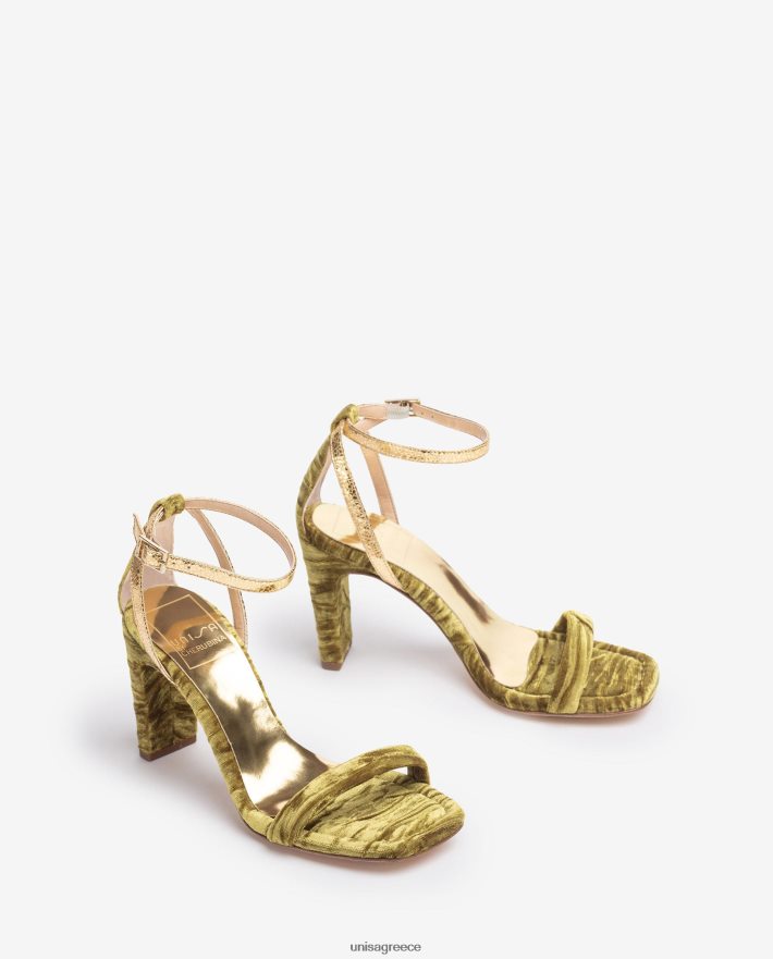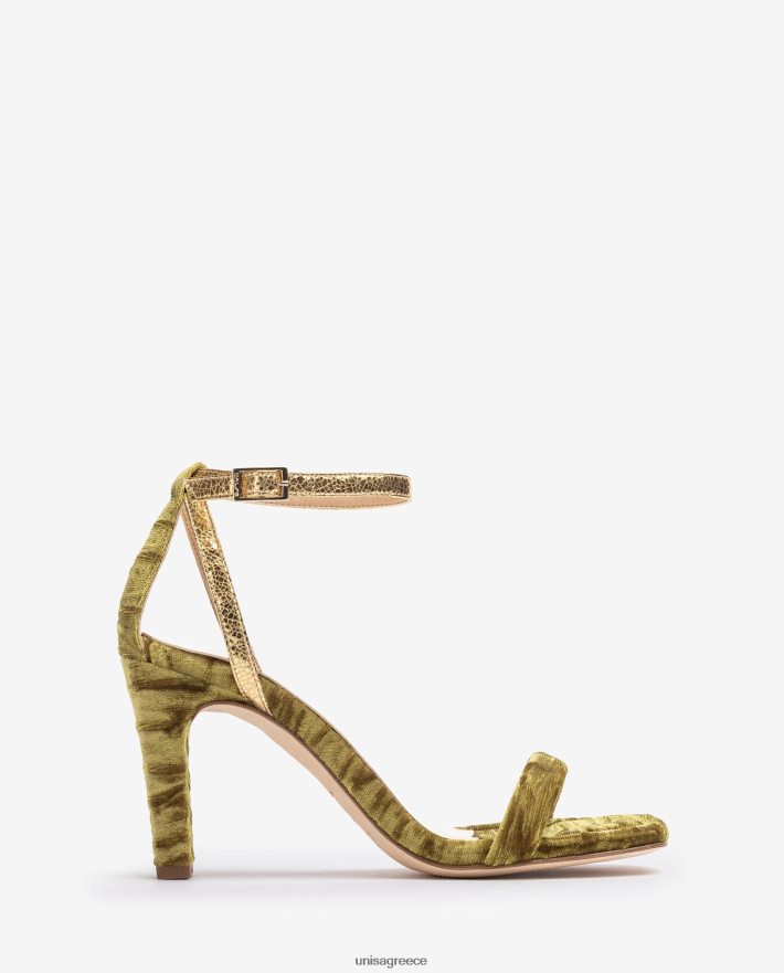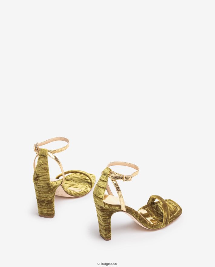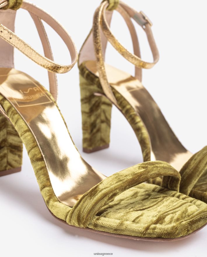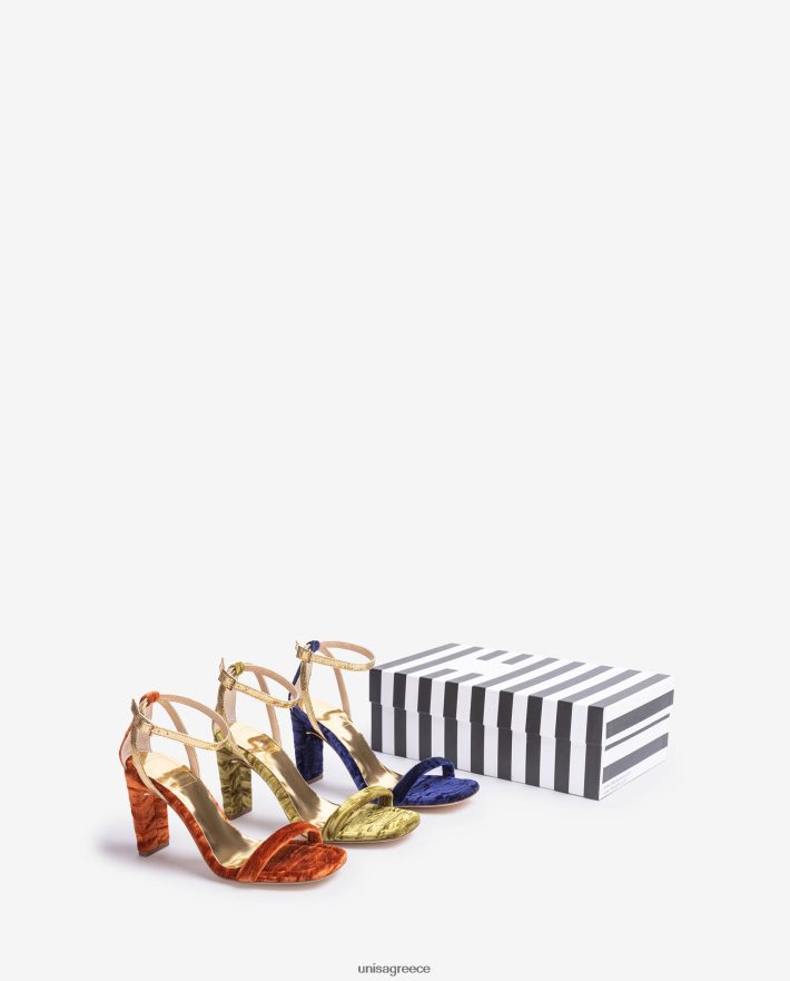 πέδιλο τετράγωνης σόλας από βελούδο. Λεπτοί χρυσοί ιμάντες αστραγάλου που μπορούν να προσαρμοστούν χρησιμοποιώντας τη μεταλλική πόρπη. Τακούνι ύψους 8,5 εκ. ντυμένο με βελούδο. δερμάτινη σόλα. η νέα συλλογή unisa της cherubina θα σας συνεπάρει με την τελειότητά της. Η