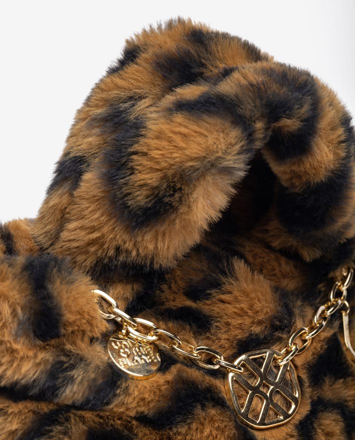 μικρή μίνι τσάντα από ανακυκλωμένο μαλακό ύφασμα πέλος. επένδυση αλυσίδας και φερμουάρ. ιμάντας ώμου cross-bag εσωτερικά. 14cm x 22cm x 9cm