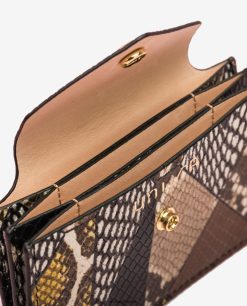 χαραγμένη δερμάτινη θήκη για κάρτες με γεωμετρικό τύπωμα εφέ φιδιού. κλείσιμο με κουμπί. διαφορετικές εσωτερικές τσέπες για κάρτες. η πιο κομψή “έκδοση τσέπης”.