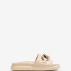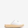 πέδιλο από δέρμα με πολύ ανοιχτόχρωμο ξύλινο μπλοκ. Αντιολισθητική εξωτερική σόλα από καουτσούκ και κομμένη επένδυση από ασορτί δέρμα.