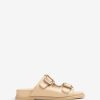 επίπεδο δερμάτινο σανδάλι με μεταλλική επένδυση με διπλή αγκράφα στο vamp. ταιριαστό χρώμα ενδιάμεσης και εξωτερικής σόλας.