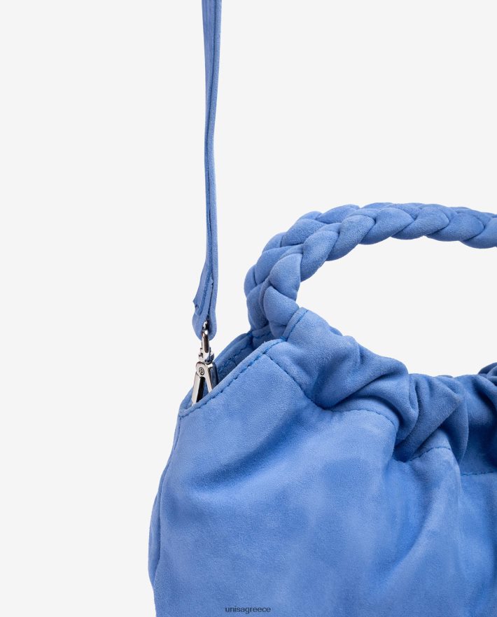μικρή τσάντα από σουέτ. στρογγυλές πλεκτές λαβές σε ταιριαστό σουέτ. ρυθμιζόμενο λουράκι χιαστί από σουέτ. ένα μαγνητικό κούμπωμα. μέγεθος: 15cm x 20cm x 6cm