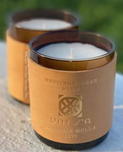 230 γρ. αρωματικό κερί, 100% φυτικό κερί και 100% βαμβάκι φυτίλι. Κεχριμπάρι γυάλινο κύπελλο, διακοσμητικό από δέρμα αγελάδας, ραμμένο στο χέρι και χαραγμένο με χρυσό εφέ.