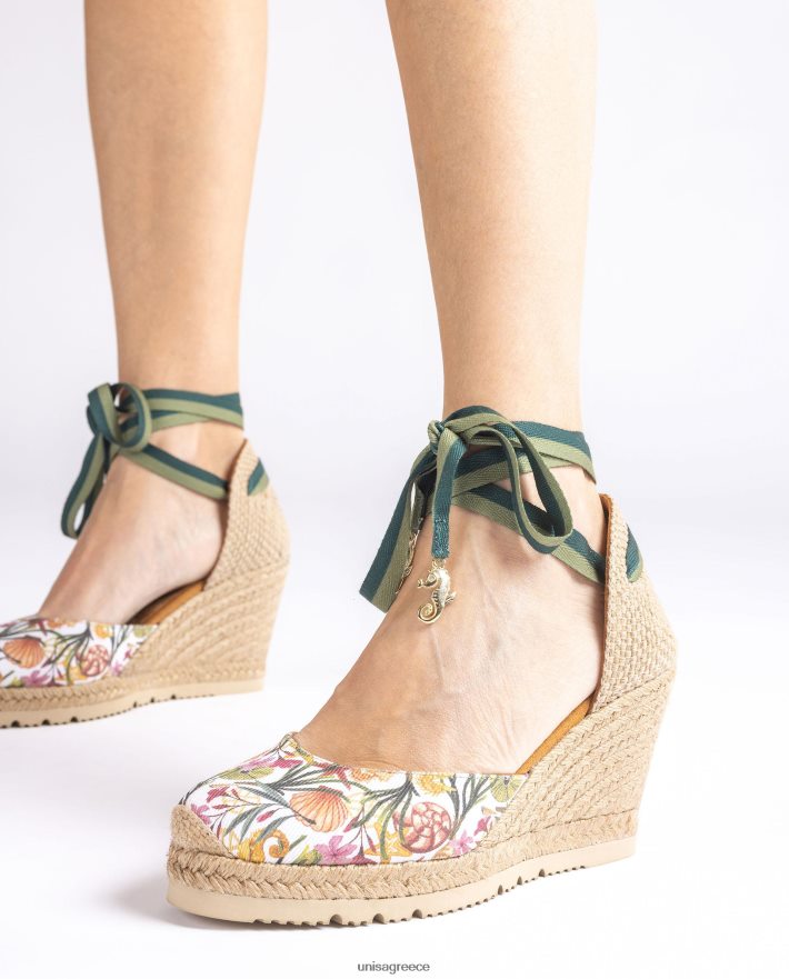 Εσπαντρίγια με στρογγυλά δάχτυλα περιορισμένης έκδοσης. φτιαγμένο από εκατό τοις εκατό βαμβακερό ύφασμα και στάμπα σχεδιασμένη για unisa από τον εικονογράφο mercedes bellido, εμπνευσμένη από τη Μεσόγειο. Σφήνα ύψους 7,5 cm καλυμμένη με φυσική γιούτα και πλατφόρμα 1 cm. ρυθμιζόμενα βαμβακερά λουριά γύρω από τον αστράγαλο και αποκλειστική χρυσή μεταλλική επένδυση στα άκρα.